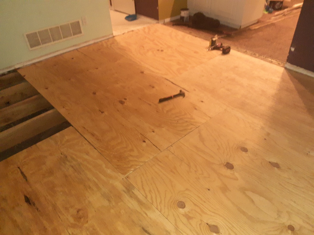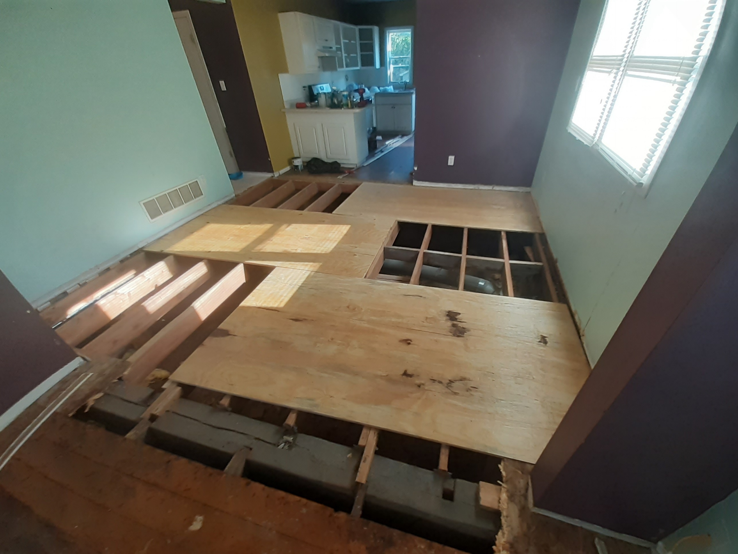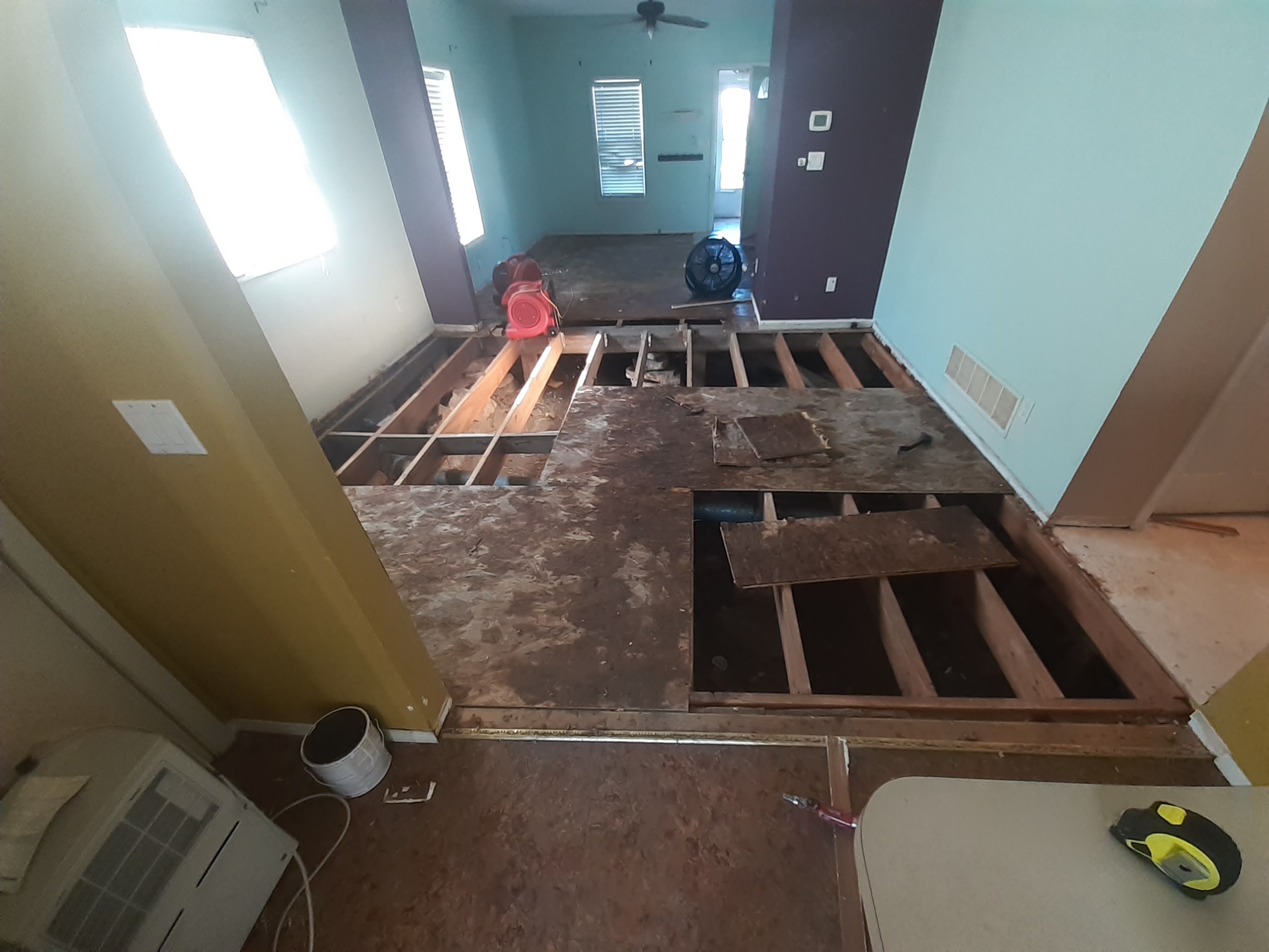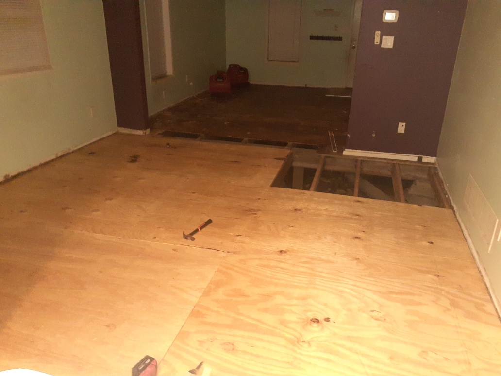 Wednesday, when we walked in, it was easy to see after drying for two whole days under commercial fans, with a dehumidifier, the subfloor was ruined. Wood prices were not in our favor, but it was unavoidable to not replace the floor that day. With an impending move on Saturday, the large amount of cleaning, and so few hours left in the week, a trip to the hardware store was the plan.